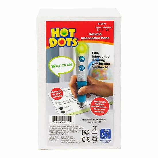 - Includes six interactive Hot Dots Talking Pens, each with brand new, sleek, silver design, 17 speech and sound effects, and flashing lights.