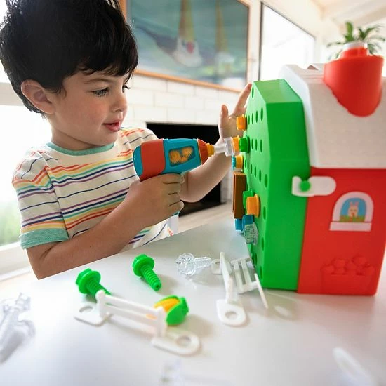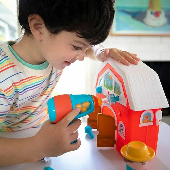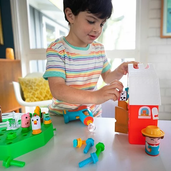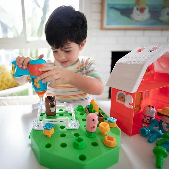 - Kids use a real, working, kid-safe toy drill to build their very own farm, complete with crops, fences, and animal friends, creating a customized farmyard perfect for pretend play