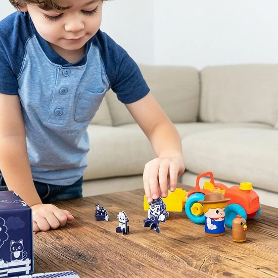 - Child-friendly screwdriver, seven decorative bolts, four snap-together tractor pieces, Bolt Buddy Farmer and chicken figures, corn, and trailer