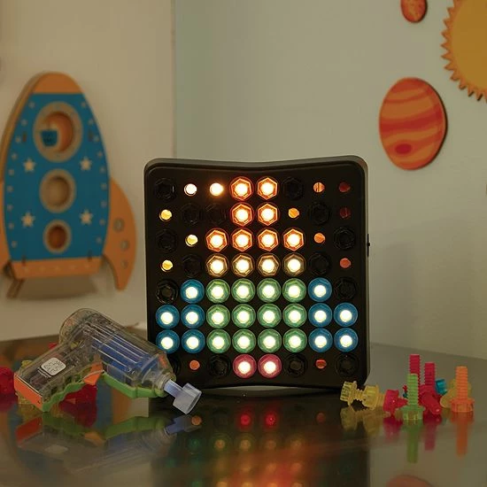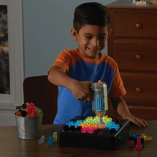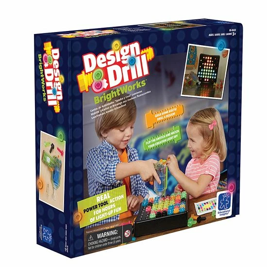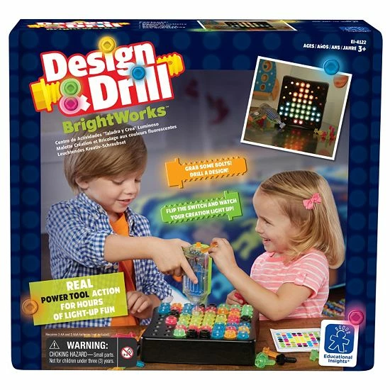 Little designers use the kid-friendly drill to insert the translucent fun bolts, following one of the included patterns or designing their very own glow-in-the-dark creations, then watch as their light-up designs “dance” to sound and music with this Educational Insights Design & Drill BrightWorks.