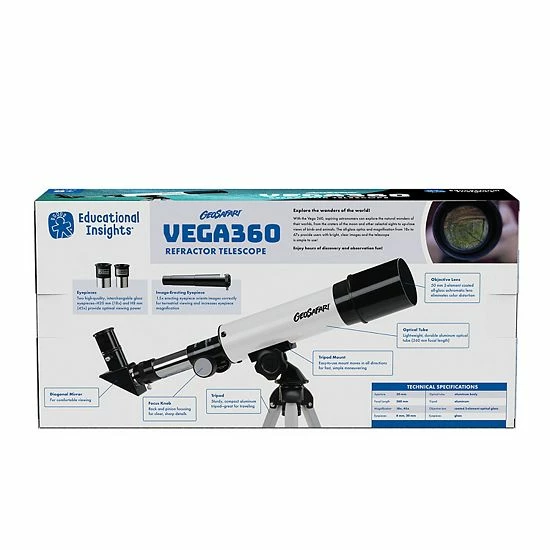 Get a closer view at distant objects on land and in space with the Vega 360 Telescope! This lightweight, portable scope includes a tripod and offers 20x, 40x, and 80x magnifications. Explore and discover with the Vega 360 Telescope!
