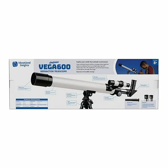 Both inquisitive young scientists and adults will enjoy investigating the universe through the precision optics of the Vega 600. With magnifications from 30x to 75x, all-glass optics, and rack-and-pinion focusing, stargazers and nature watchers are rewarded with bright, clear images. Perfect for scoping out rare birds or animals, as well as the moon, planets, and even binary stars.